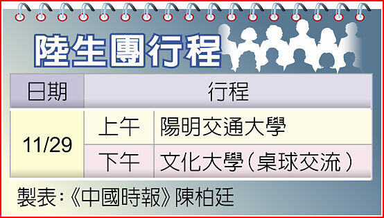 陸生團來台行程進入第二天,28日上午前往政治大學達賢圖書館與師生座談,大陸桌球國手、奧運6金得主馬龍抵達現場便受熱情學生包圍。政大學生認為,可參照過去的「乒乓外交」,以體育促進兩岸交流,降低兩岸歧見,會是非常好的切入點。而馬龍等陸生團員昨晚走訪西門町與華西街夜市,大啖美食。馬英九基金會執行長蕭旭岑透露,馬龍29日將到文化大學進行「桌球交流」。