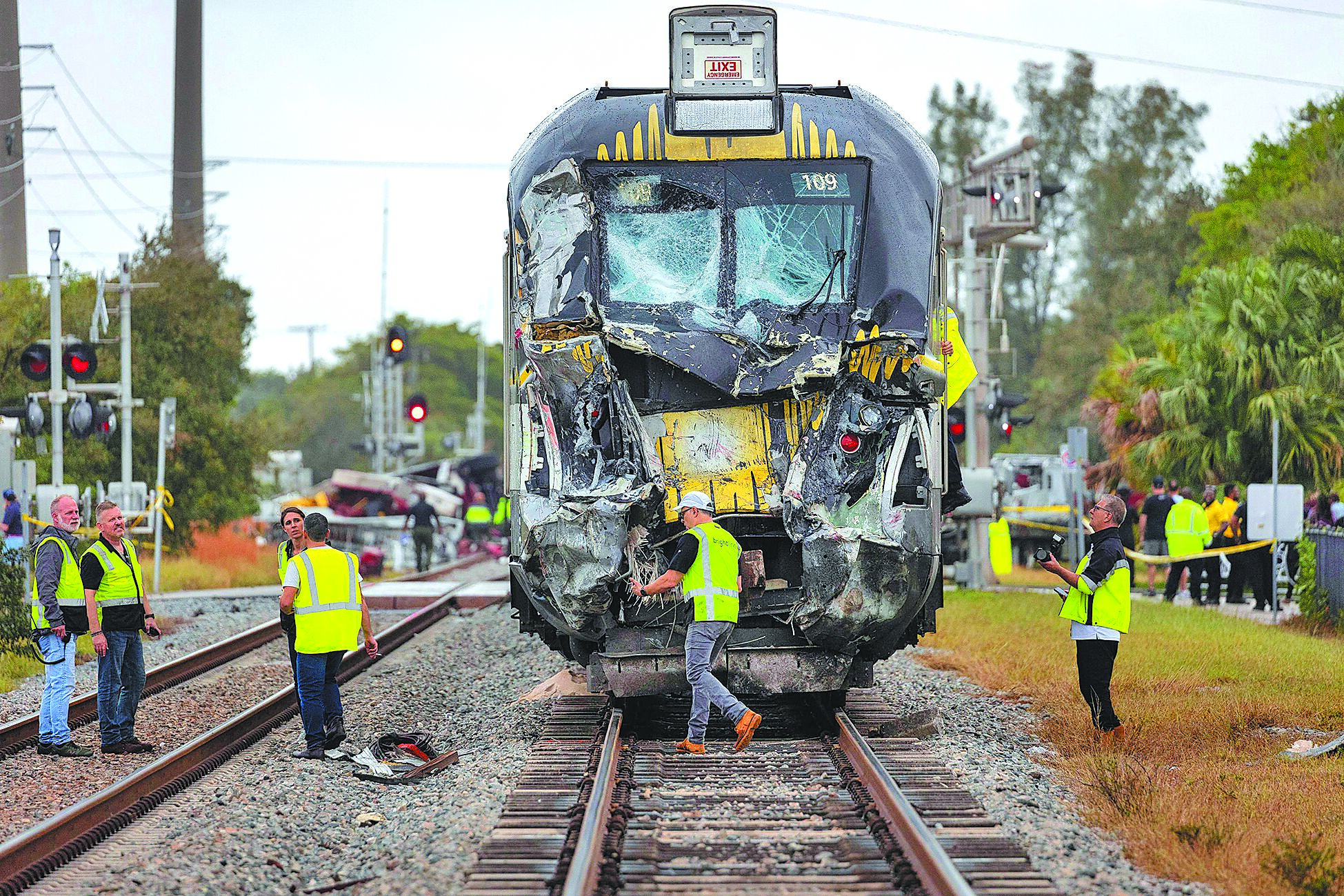 美國佛州28日發生一起火車撞上消防車的事故,消防車當場被撞成兩截,造成15人受傷。起因是消防車搶快,在一列貨運火車通過後,沒等平交道柵欄升起就繞過柵欄企圖通過,被隨後而來的火車撞上。(文:鄭任南 圖:路透)