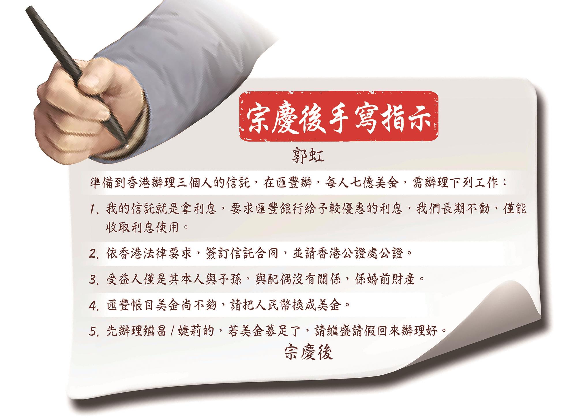宗慶後手寫信託指示 每人七億美金在匯豐辦