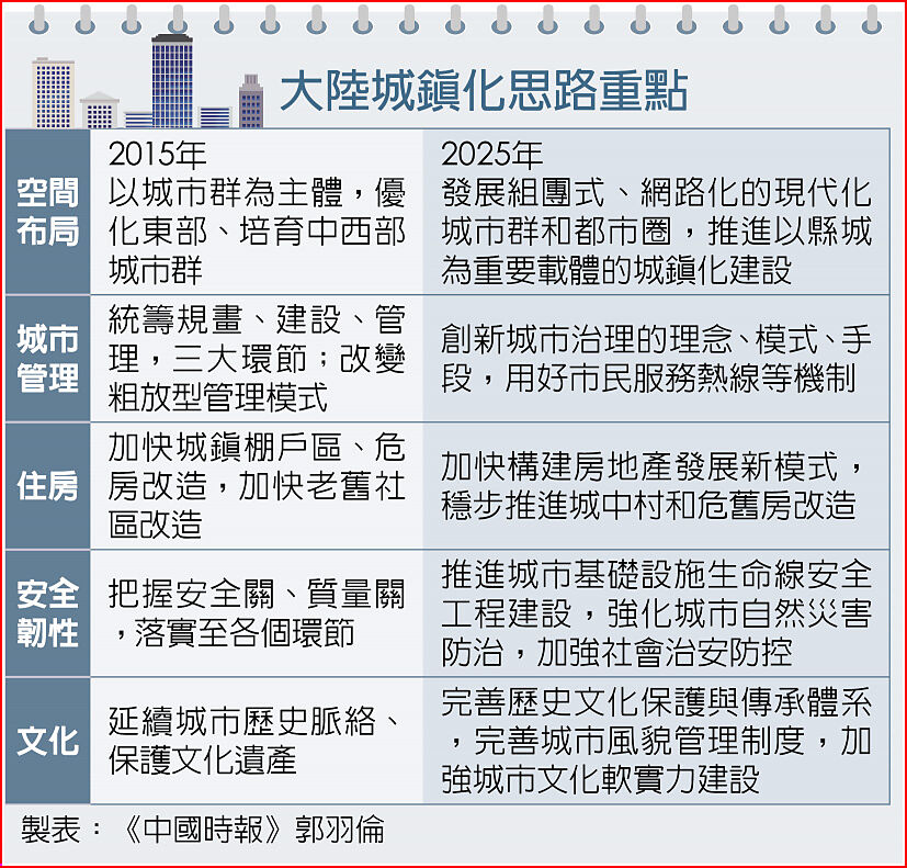 今年會議指出,大陸城鎮化正從快速增長期轉向穩定發展期,城市發展目標落在建設創新、宜居、美麗、韌性、文明、智慧的現代化人民城市共7大重點任務。會議並明確「五個轉變」,包括要轉變城市發展理念、城市發展方式、城市發展動力、城市工作重心以及城市工作方法。