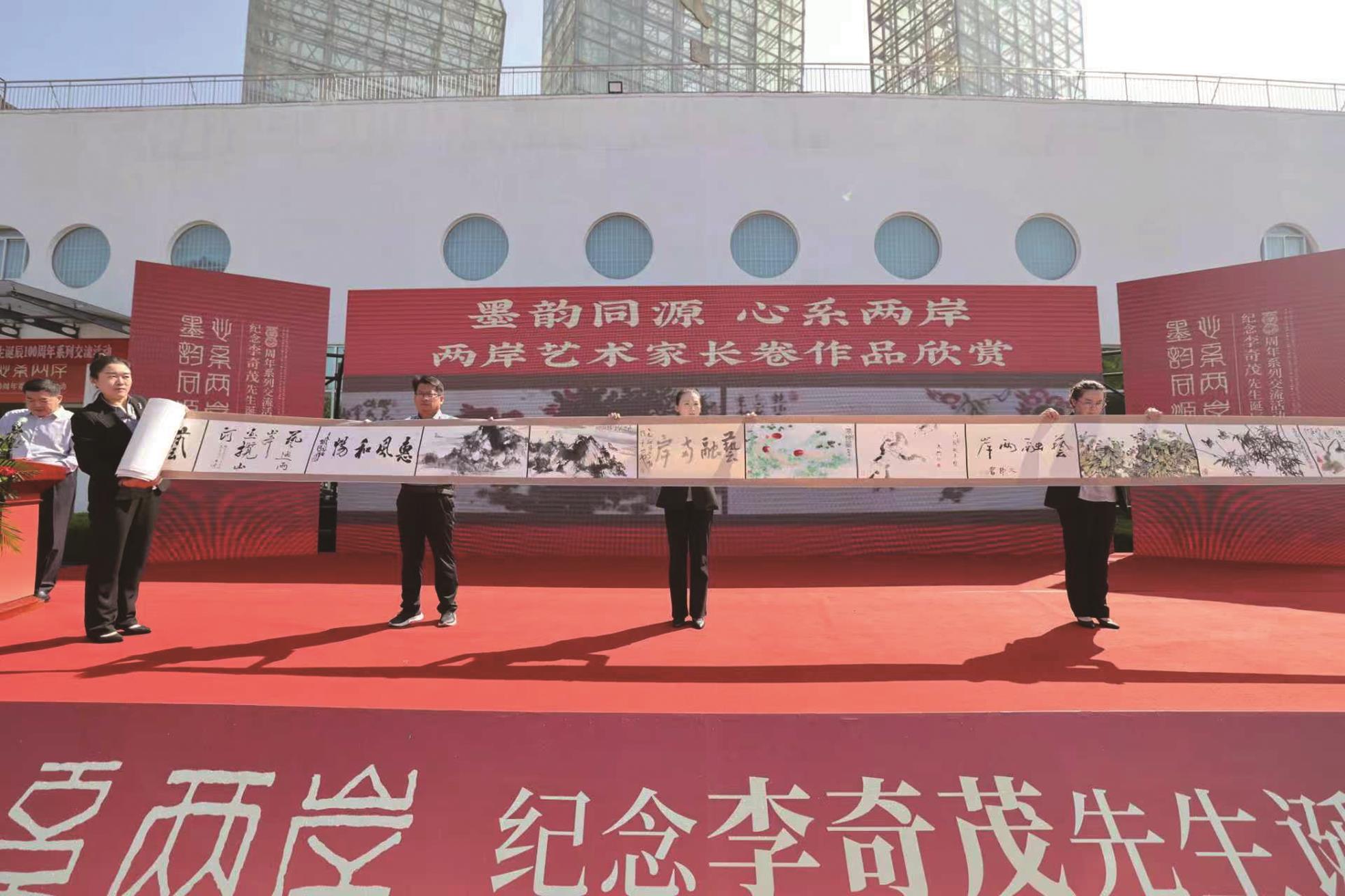 儀式現場,主辦方向李奇茂家屬贈送了紀念書畫集、紀念郵票集及印譜集,這些珍貴實物定格了大師的藝術足跡,也承載著對他的無限敬意。隨後,長達數米的「兩岸一家親 翰墨繪同心」書畫長卷在現場緩緩展開,兩岸書畫家筆墨交融,直觀呈現「墨韻同源」的深厚情誼。
