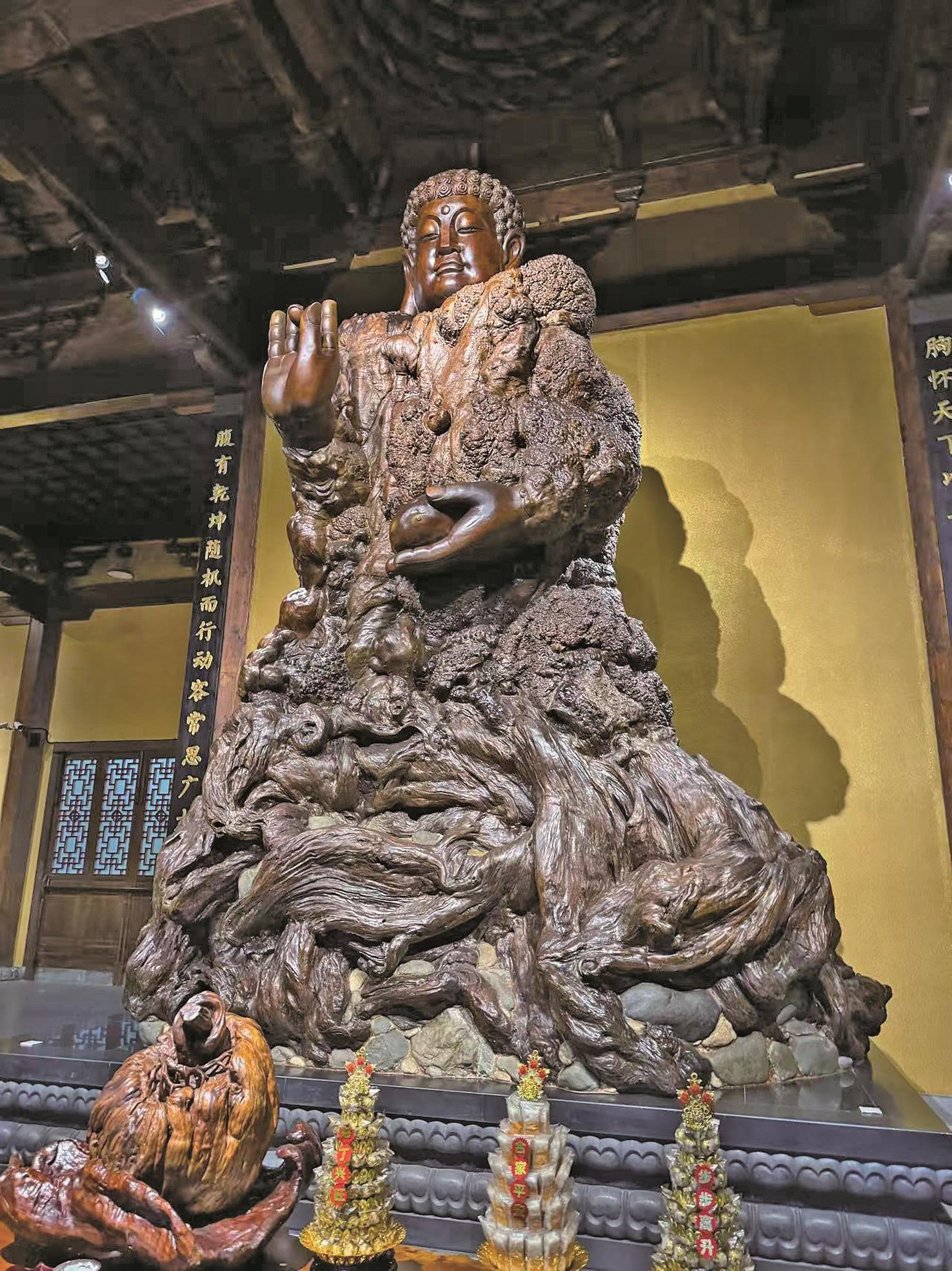 導覽人員介紹巨型釋迦牟尼佛根雕的傳奇色彩,從發現原材便已開始。這株珍稀黃心楠千年老根原本在緬甸小鎮工廠中等待被鋸解,當時恰巧被創辦人、浙江省工藝美術大師徐谷青遇見。他不忍千年根材被破壞,遂斥巨資將其購下。從緬甸一路運至開化,道路崎嶇、運輸艱難,宛如一場苦行。根材抵達後,又歷經多年雕琢,作品定型後,大殿才依根雕形制重建屋頂,可說是一座殿為佛立、佛為木生的傳奇建築。