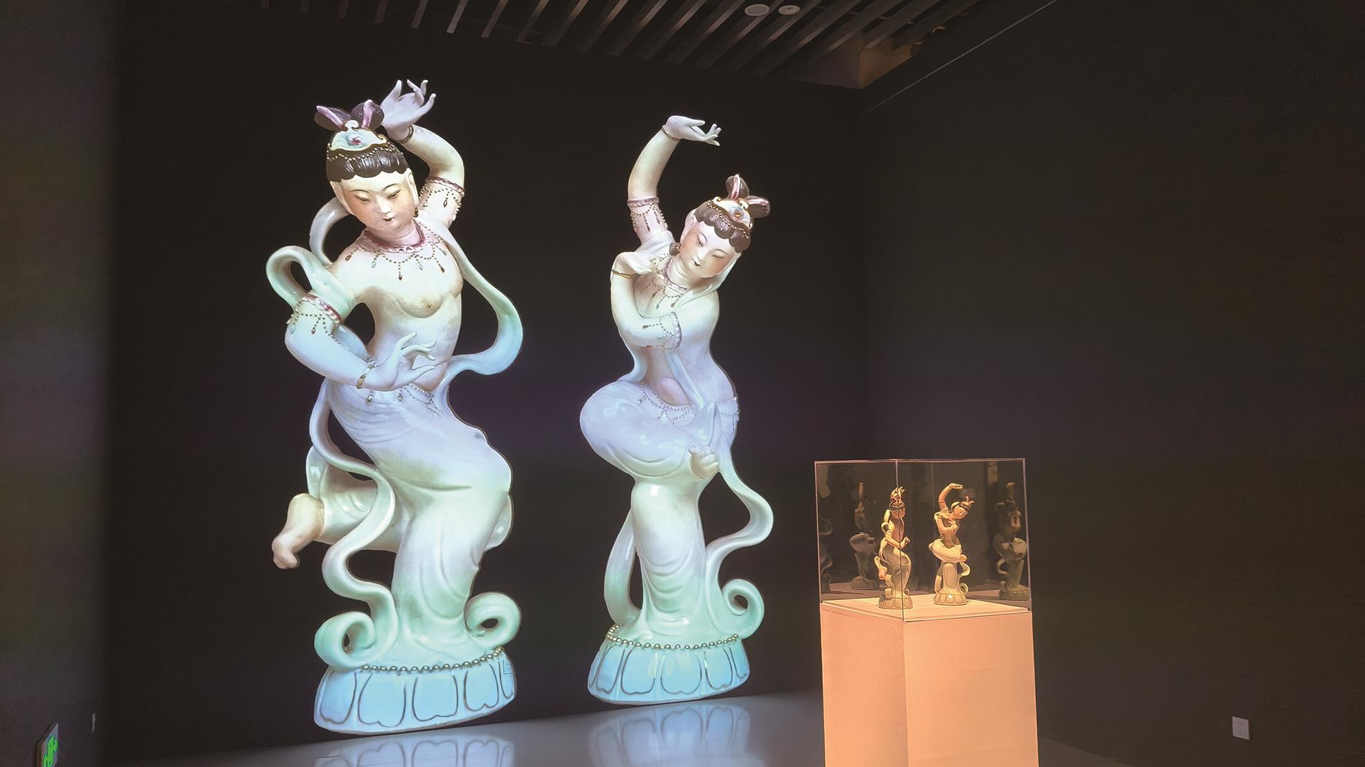 展廳內,敦煌藝術與陶瓷工藝的碰撞令人驚豔。莫高窟第328窟複製的8件唐代彩塑惟妙惟肖,完整保留初唐佛像的豐腴神韻;《千手千眼觀音》等作品運用青花、五彩等技藝,將敦煌壁畫的斑駁肌理凝固定格。由藝術家范敏祺團隊創作的兩大高溫顏色釉瓷窟裝置尤為吸睛,其未照搬洞窟原型,融入千佛元素後以高溫顏色釉直繪陶坯,窯變形成的流痕複刻出壁畫歷經風霜的斑駁感,實現釉色與畫意的交響。「這是中華優秀傳統文化兩大藝術門類的當代對話。」敦煌研究院副院長張元林評價道。