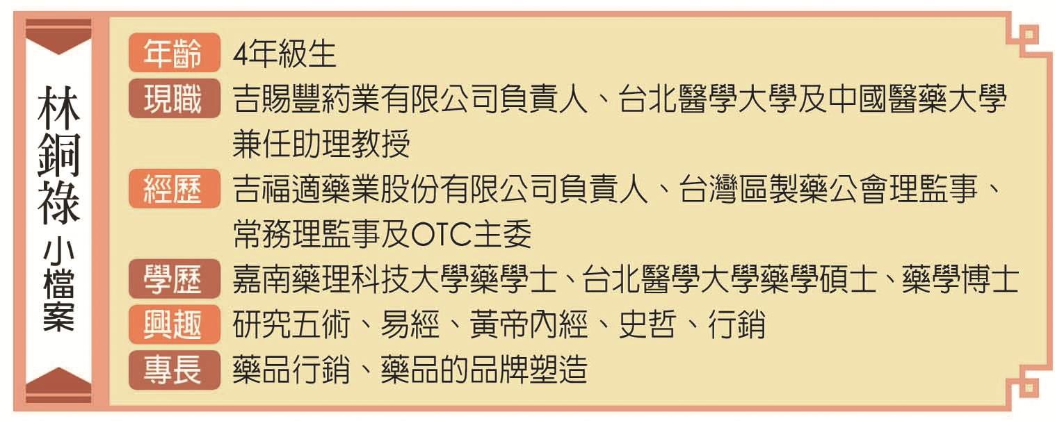 林銅祿特別強調彌合易經「天道」的實踐,源於他的人生經歷。畢業於台北醫學大學、擁有藥學碩博士學位的他,40多年前投入胃藥市場,打造出胃藥龍頭品牌「吉胃福適」。然而108年,品牌被奪,公司被迫解散,事業遭逢重大挫折。他以王陽明心學「知行合一」自我砥礪,並於110年創立「吉賜豐葯業」,以獨資方式重返胃藥市場。