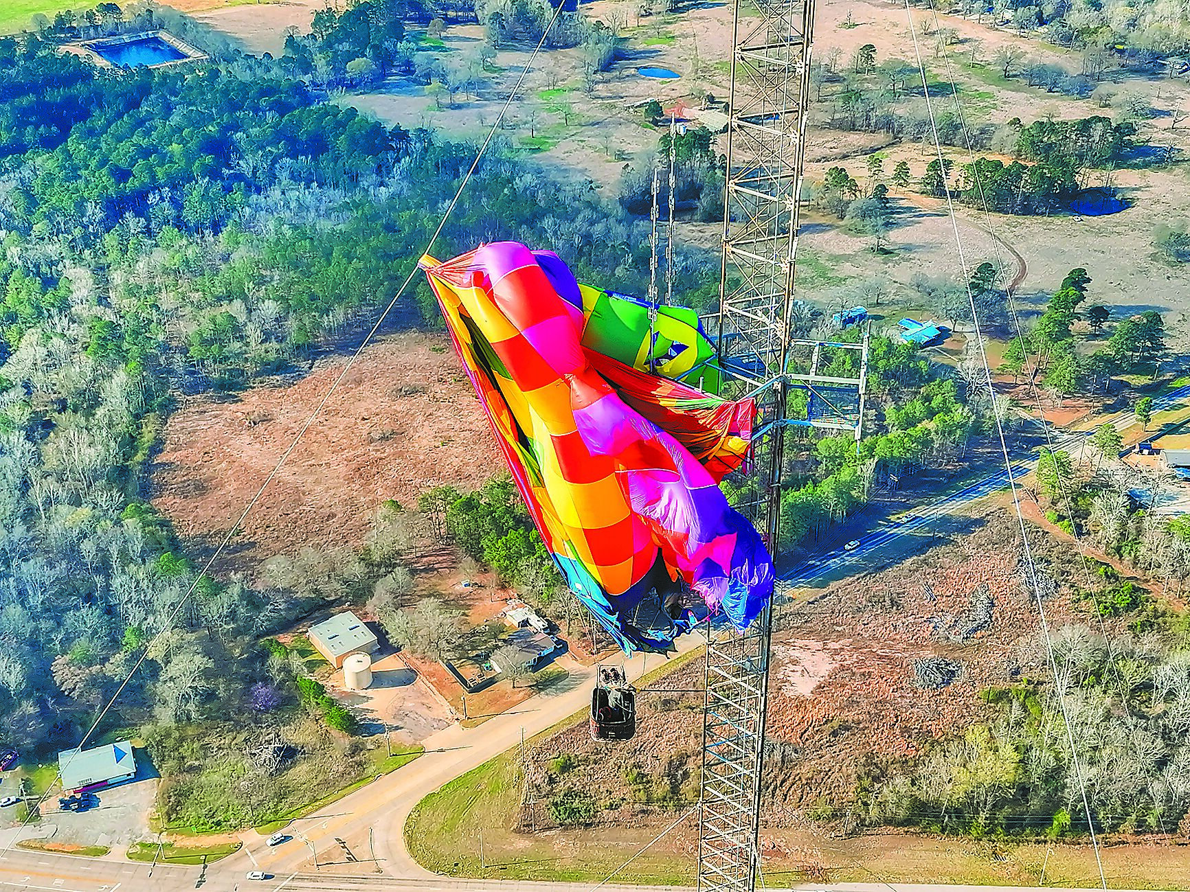 美國德州消防員們正在努力將兩名被困在通訊塔上的氣球飛行員救出。(美聯社)