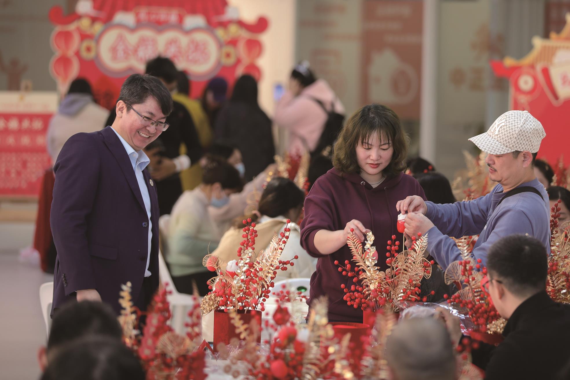在 「花福桶DIY」 區,桌面上擺滿了紅冬青、金黃的銀杏葉、寓意節節高的銀柳以及各式各樣的新春祝福掛飾。在花藝老師的指導下,榕台職工們兩兩搭檔,開始創作屬於自己的「新春福桶」。台幹蔡小姐手捧著剛插好的紅福桶,笑著說:在台灣,過年我們也喜歡買銀柳和裝飾品回家插,寓意「銀兩」進門。今天這個福桶更特別,上面有「福」字、有中國結,和福州同事一起做,感覺就像一家人圍在一起裝點自己的家。