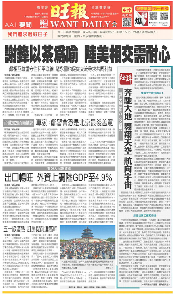 AD 專家:鄭習會恐是北京最後善意 出口暢旺 外資上調陸GDP至4.9% 五一旅遊熱 訂房提前達高峰 謝鋒以茶為喻 陸美相交需耐心 奔馳大地 翱翔天空 航向宇宙