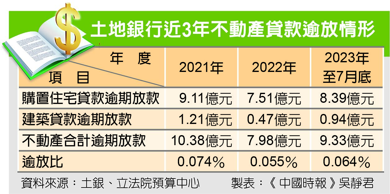 不動產市場出現警訊!立法院預算中心報告指出,國內不動產放款龍頭─土地銀行7月底不動產逾期放款金額,較2022年底增加了1.35億元,上升0.009個百分點,逾放增加表示貸款人還款不穩定,提醒明年不動產市場經營環境混沌不明,相關放款須審慎小心。