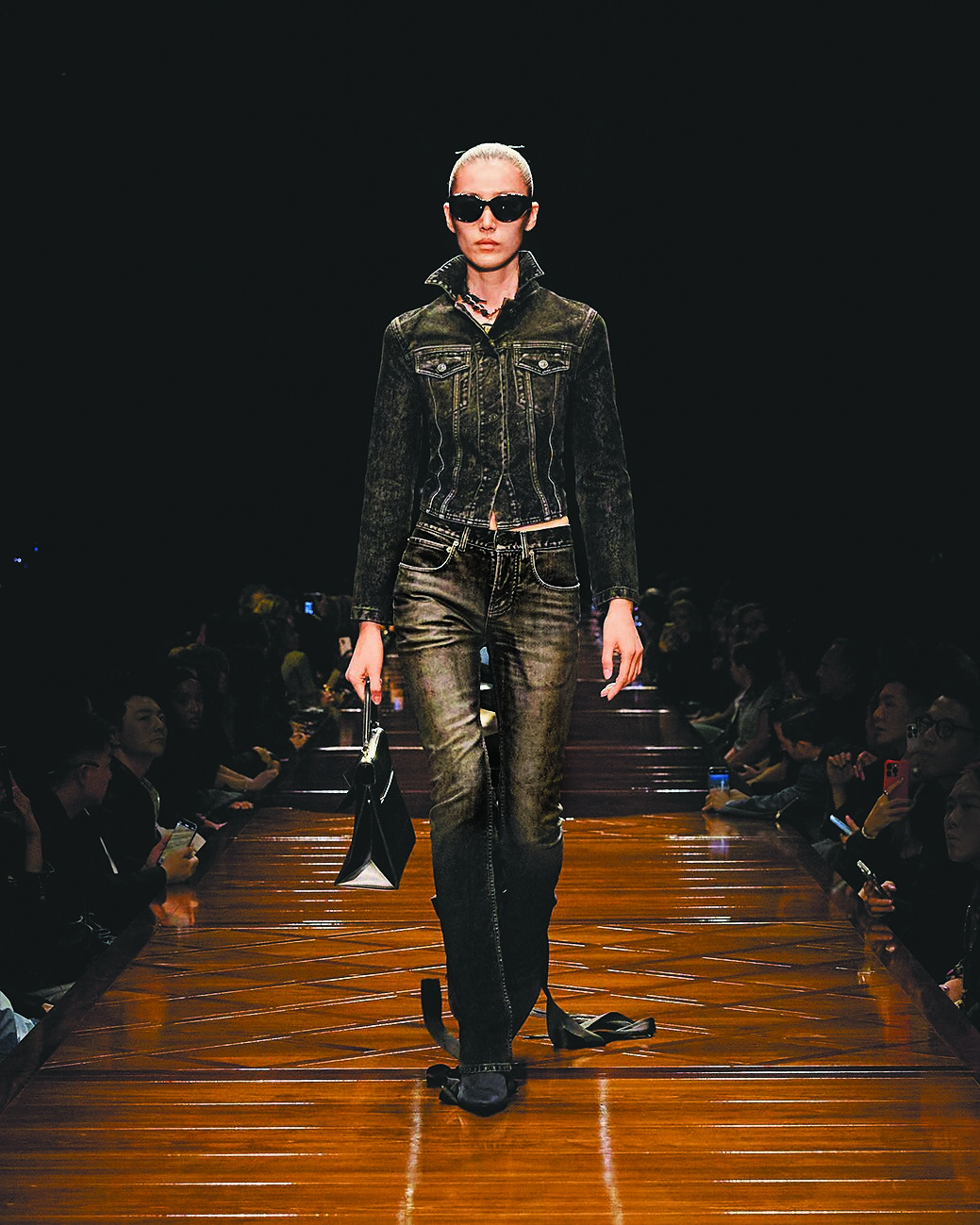 服裝呈現出裸露又性感的蕾絲抹胸上衣與褲襪,這種相對性感的造型源自他對兒時身邊女性親人的性感姿態。也有不少夾克以繭型結構拼接工裝外套,皮質夾克上的漏斗領設計與長版丹寧褲結合長靴,各種充滿怪奇姿態的設計,成為這季大秀驚奇的服裝重點。