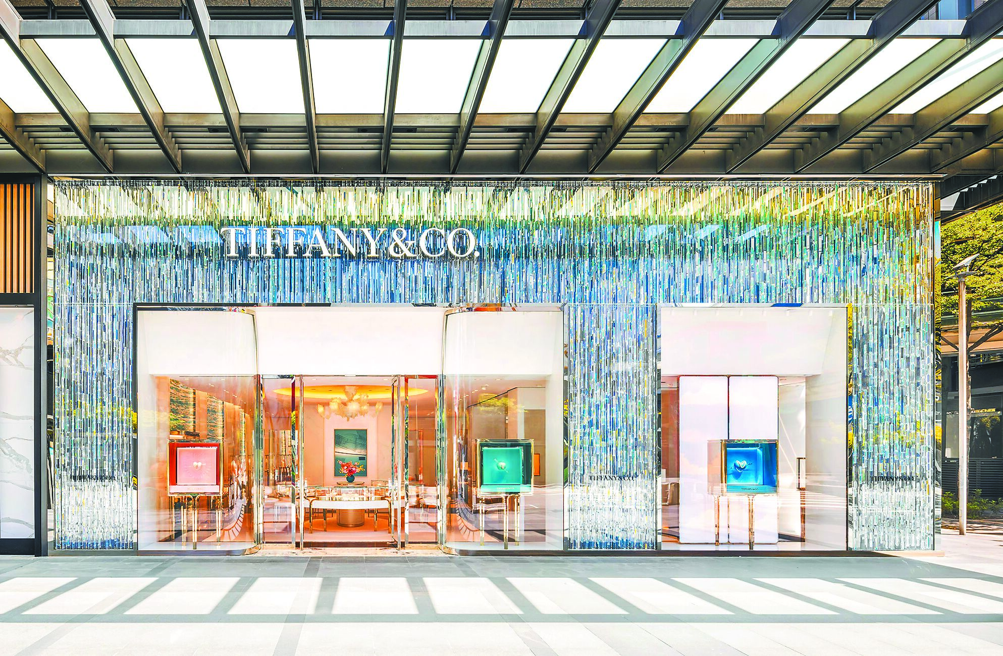 TIFFANY信義商圈形象專門店呼應紐約第五大道地標旗艦店的奢華時尚,街邊的水晶棱鏡挑高外牆由建築設計師Hugh Dutton打造,在白天豔陽或夜間燈海的照射下,閃爍著絢麗奪目的粼粼波光,猶如一顆璀璨閃耀的寶石,是信義商圈璀璨新地標;店內裝潢設計由建築師Peter Marino操刀,細節融入品牌DNA,再加上錯落的當代藝術家畫作與裝置藝術,濃濃的藝術品味。
