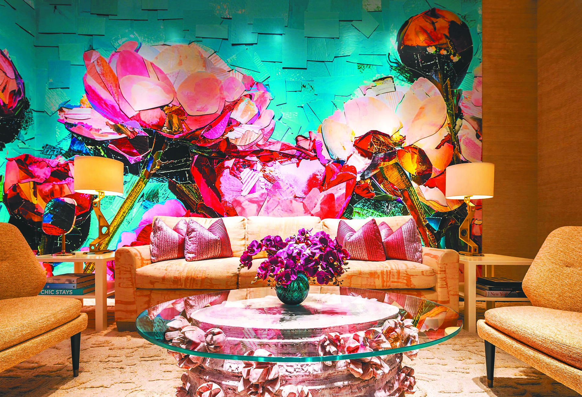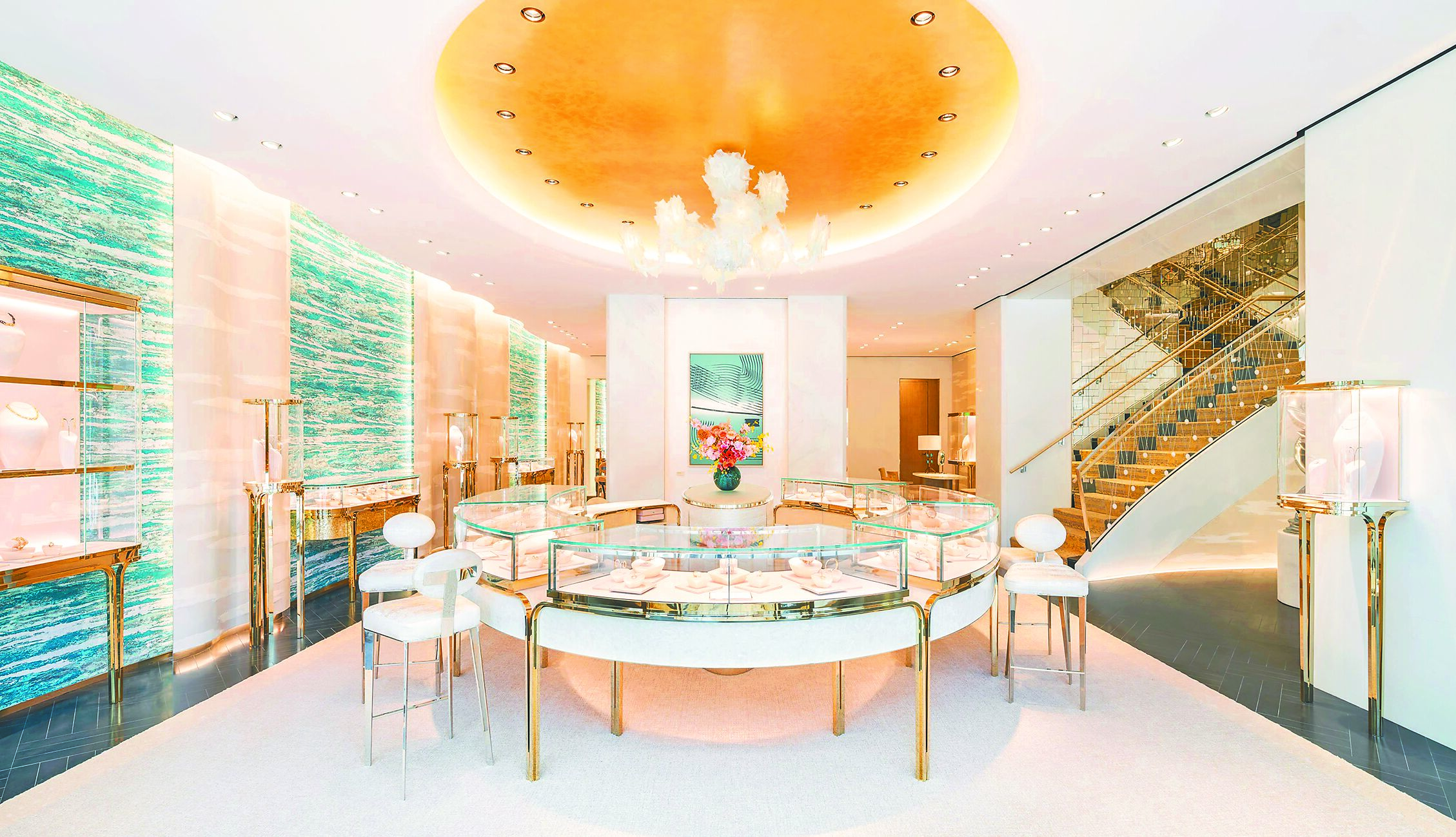二樓的高級珠寶沙龍區陳列以寶石切割為靈感打造的展示櫃與三角玻璃櫥窗,美籍藝術家南西洛倫茲設計的巨幅手繪藝術屏風氣勢恢弘,完美烘托熠熠生輝的TIFFANY高級珠寶作品。為了打造舒適且私密的珠寶鑑賞空間,店內設置三間VIP沙龍空間,每間VIP沙龍各有特色,其中位於一樓的VIP沙龍空間,邀請巴西當代藝術家維克穆尼斯以絢麗牡丹拼貼藝術創作裝飾牆面,以印刷品勾勒高貴豔麗的牡丹花卉,用色大膽且充滿前衛創意。