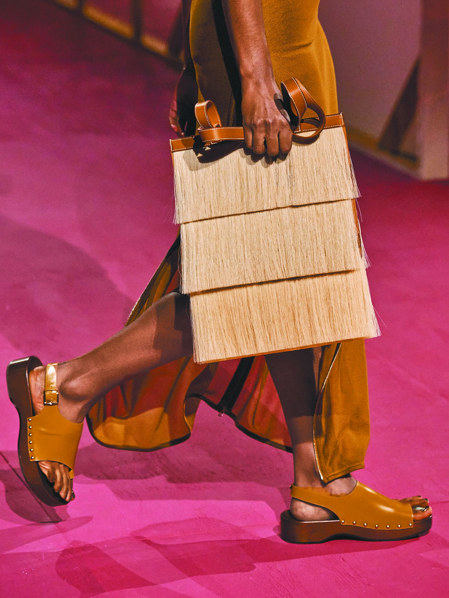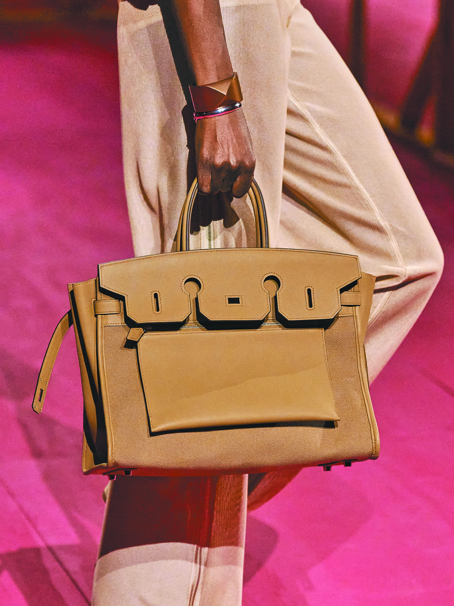 本季配件也同樣充滿不少亮點,同樣依循工作室原則而生,inside-out的柏金包,採用皮革和麻質製成,連鎖頭也反轉至內裡,吸睛度相當強烈;另外也有使用馬毛編織而成的扁平手袋、藤編的鏤空圓筒包,或是小牛皮厚底涼鞋等等,也都巧妙的融入工作室元素,為此季女裝大秀帶來獨特新意。