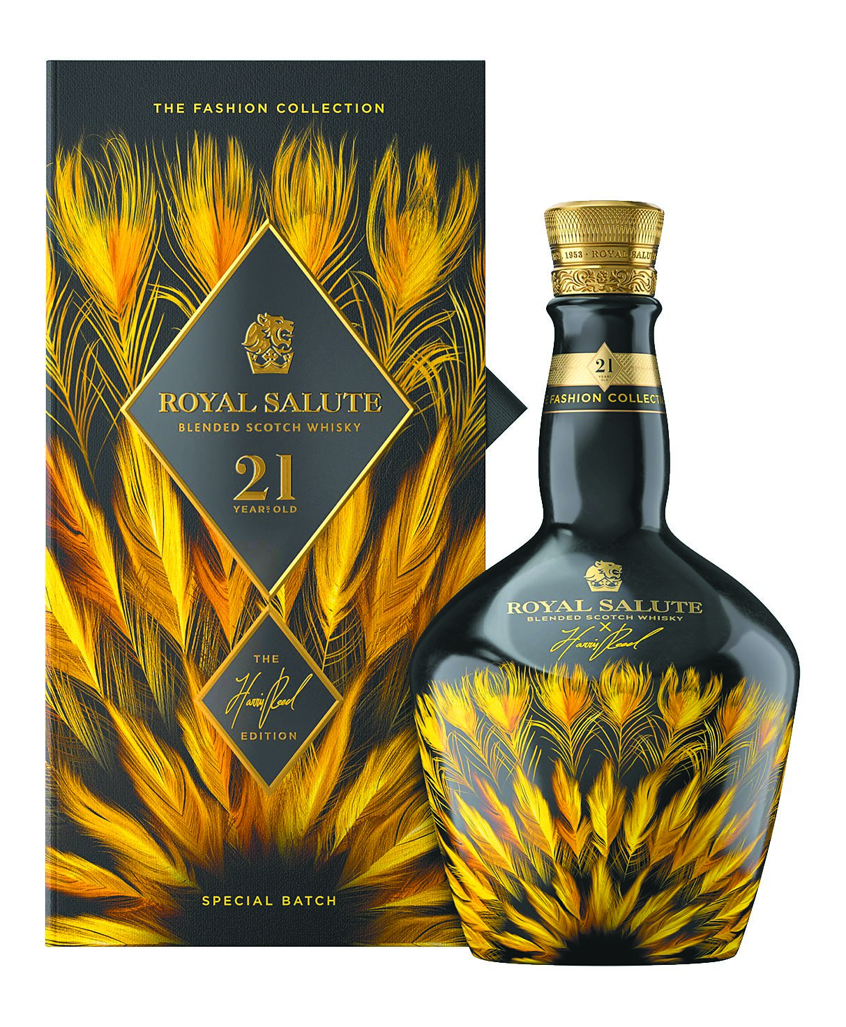 皇家禮炮跨界攜手高訂服設計師Harris Reed打造新奢時尚系列聯名威士忌,今年推出第三代,分別是燦金羽冠限定版和耀紫羽冠限定版,以象徵皇室風華的金色與紫色,詮釋威士忌的奢華時尚風情,並選在台北表演藝術中心舉辦時尚大秀,將Harris Reed最具特色的個人風格表現得淋漓盡致。飲酒過量有礙健康