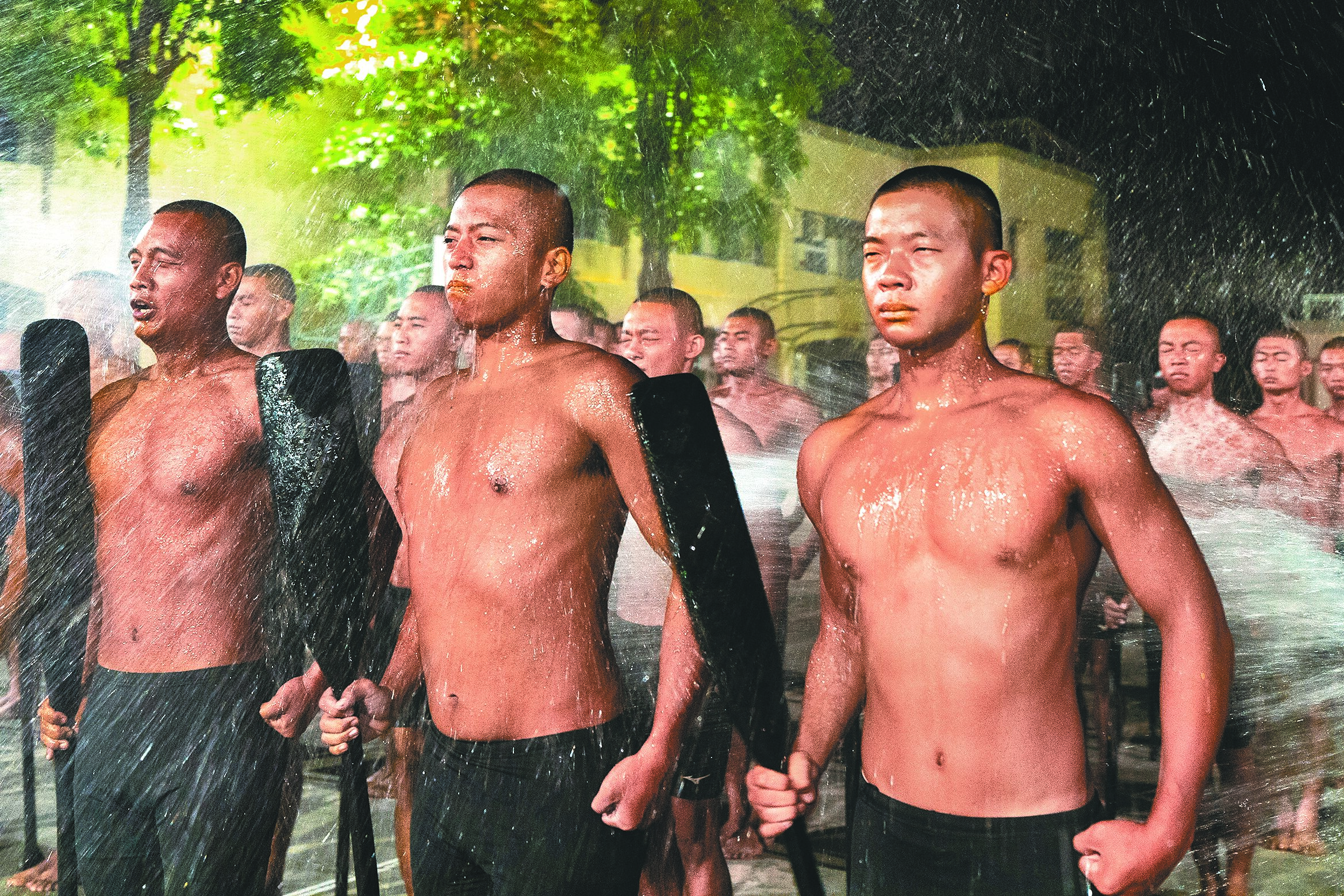兩棲偵搜專長班第158期學員,日前展開6天5夜俗稱「克難周」的綜合考驗訓練,第3天於桃子園沙灘執行蛙人操、技巧運動及武裝泅渡等訓練,圖為黎明時分,學員進行武裝泅渡課程,需完成裝備防水及綑綁,並攜帶個人武器,以艇為單位共同完成5千公尺的武裝泅渡。(圖文:軍聞社)