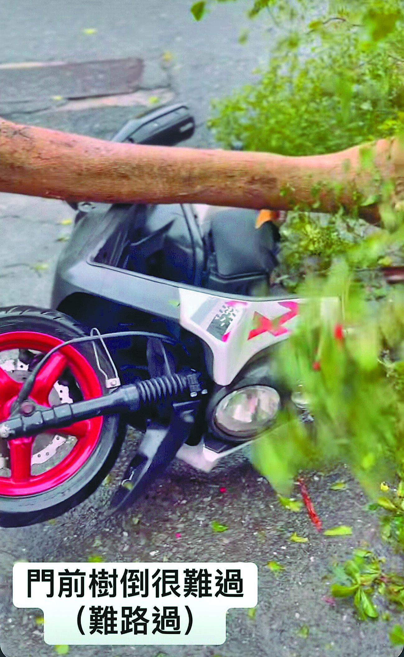康芮颱風10月31日挾帶狂風暴雨席捲全台,22縣市停班停課,原住民女歌手紀曉君昨透過社群分享台東自家住處遭颱風肆虐情形,畫面中清楚可見強風豪雨不斷,兩旁路樹不停搖晃,她家門口的大樹不敵侵襲,被強風攔腰折斷,樹木壓倒停在一旁的機車,完全沒有行人敢在路上走動。