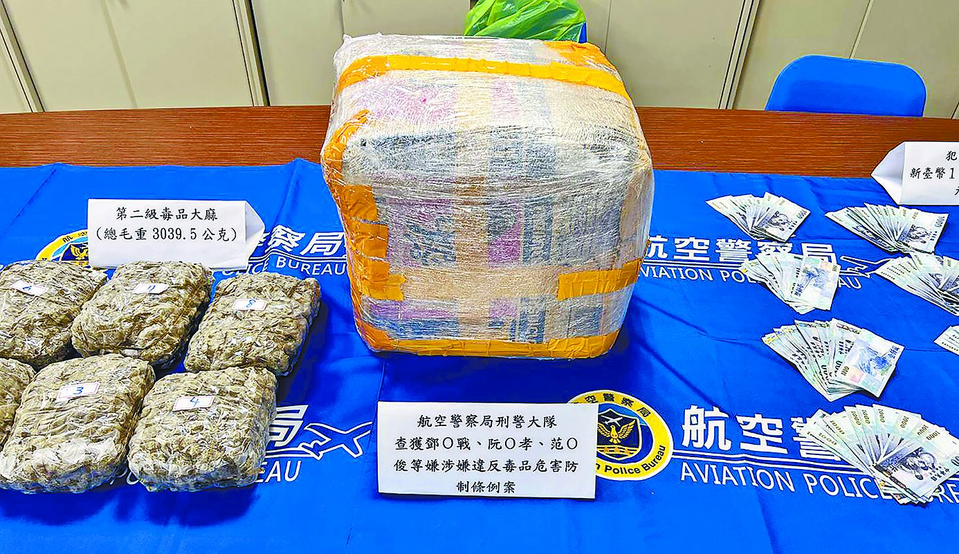 警政署航警局12日宣布,日前破獲由5名越南籍人士在台組成販毒聯盟,涉嫌從泰國走私毒品來台,成員以學生身分取得駕照運毒,賣給國內外籍移工,此次查扣5公斤大麻及新台幣14萬餘元贓款,5人依違反《毒品危害防制條例》、《組織犯罪條例》等罪嫌送辦,案經檢方偵結起訴。(航警局提供/陳麒全桃園機場傳真)