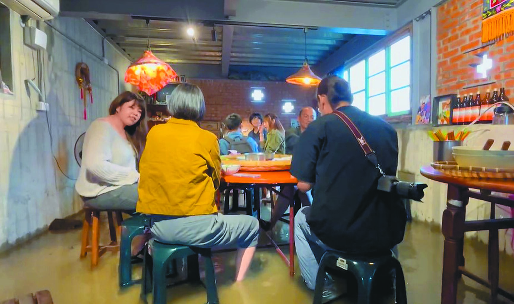 五結鄉西河五路「阿芳鹹粥」昨上午11時許有水淹進店裡,店內水深及腳踝,顧客雙腳、褲管泡在水中享用餐點,苦笑吃的是正港「流水席」。