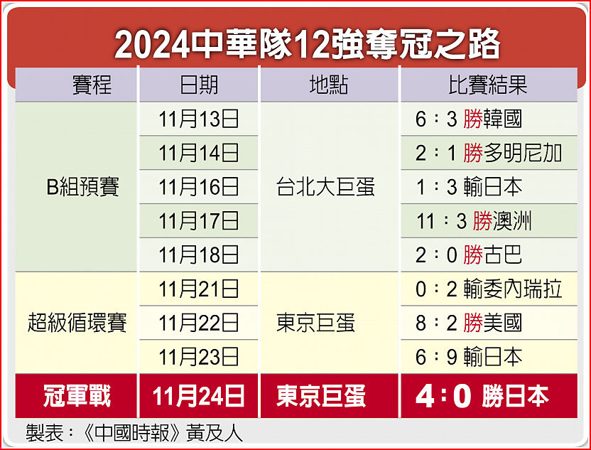 中華隊一舉奪冠,賽前賴清德總統就指示,不管輸贏都要讓全隊光榮凱旋,25日返台班機將有軍機伴飛,26日中午行政院長卓榮泰午宴,下午則是到總統府接受賴清德接見,並比照奧運舉行「英雄大遊行」。(相關新聞刊B3)