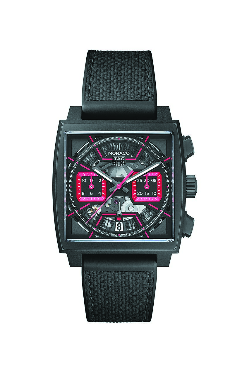 運動表與賽車有著緊密的連結,於1969年問世的泰格豪雅(TAG Heuer)Monaco系列腕表,更是箇中代表作,方型表殼的外觀,是表壇最具代表性與識別度的腕表。今年全新登場的Monaco鏤空計時腕表粉紅款,以近日華麗登場的F1拉斯維加斯大獎賽為靈感,將拉斯維加斯天際線五光十色的粉紅霓虹元素融入腕表當中,粉紅力量加持,更添風馳電掣的驅動力。