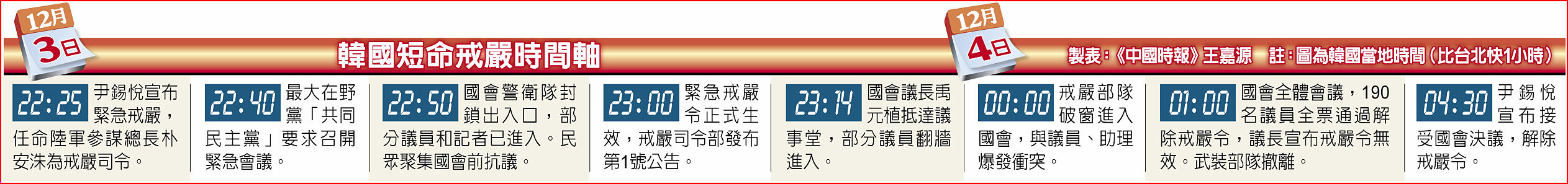 韓國總統尹錫悅3日深夜閃電緊急戒嚴,在遭到國會投票否決後,隨即宣布解嚴,前後僅6小時。但這場「短命戒嚴」,引發韓國數十年來最大政治危機,在野6黨4日向國會提交彈劾案,最快6日表決。尹錫悅面臨彈劾攻勢,總統寶座恐不保,他預計今日發表演說並致歉。國防部長金龍顯4日晚已就戒嚴風波向尹表明辭意。