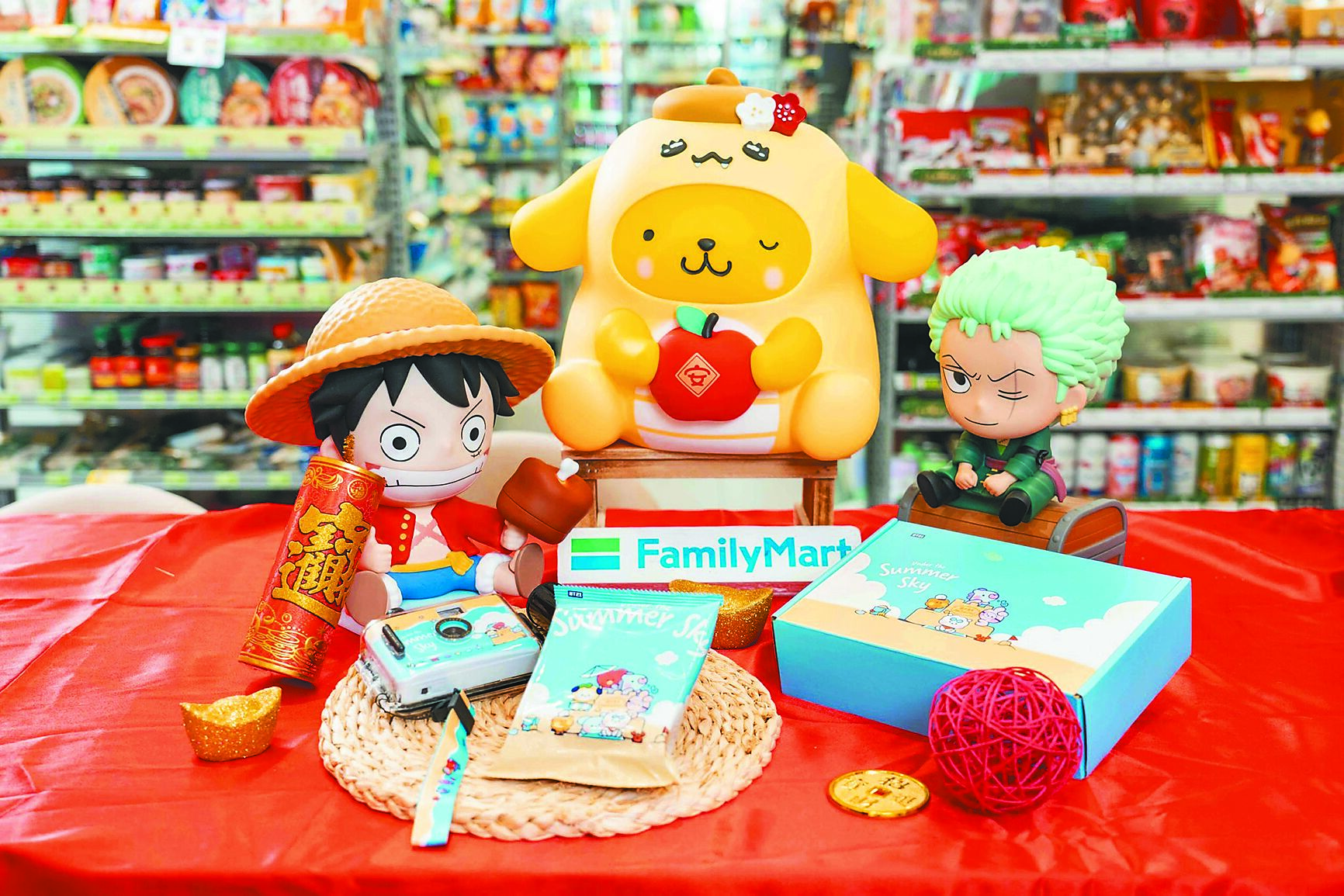 全家春節禮盒囊括蛋捲餅乾、零食糖果、肖像周邊、堅果補品、歡聚趣玩等多種類別,強打「Let’s Cafe嚴選」、「可愛肖像」、「旅行風格」三大主題,首推獨家販售的「布丁狗福蛇蜜糖造型桶」,高達36公分的造型布丁狗存錢筒,搭精緻蛇紋貼紙,讓消費者能自由DIY打造專屬造型;「魯夫拍拍燈禮盒」可見魯夫手持最愛的大塊肉且一拍即亮,並附有USB充電設計;「索隆寶藏箱存錢筒禮盒」可投零錢和索隆一起累積賞金,當居家擺飾也合適;另獨家推「史努比存錢筒禮盒」、「維尼造型蜂蜜罐堅果禮盒」等;三麗鷗當紅明星酷洛米系列則推「KU花瓣旋轉收納盤」、「愛的邱比特米果手提行李箱」等,訴求萌趣又耐用。