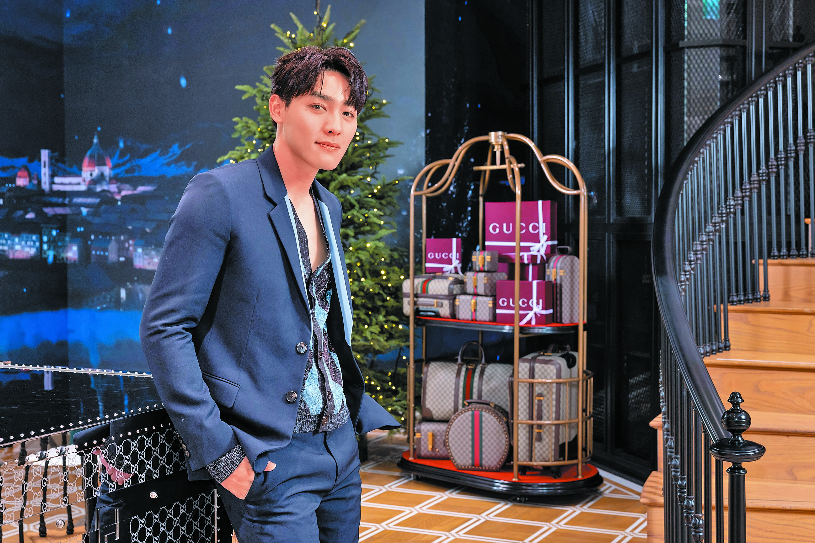 而今年27歲的陳晨威一改在棒球場上的陽光帥氣,穿上GUCCI Gift系列的藍色菱格紋針織外套,搭配暗藍色的西裝外套,看起來有些緊張的他表示自己性格比較低調,但如果出席比較重要的場合或派對,還是會偏好挑選低調中帶有一點亮點的單品,例如他身上那件針織外套就很符合他的喜好,遠看是單純的黑、藍拼接格紋,但在燈光下卻會閃爍金屬的光芒。