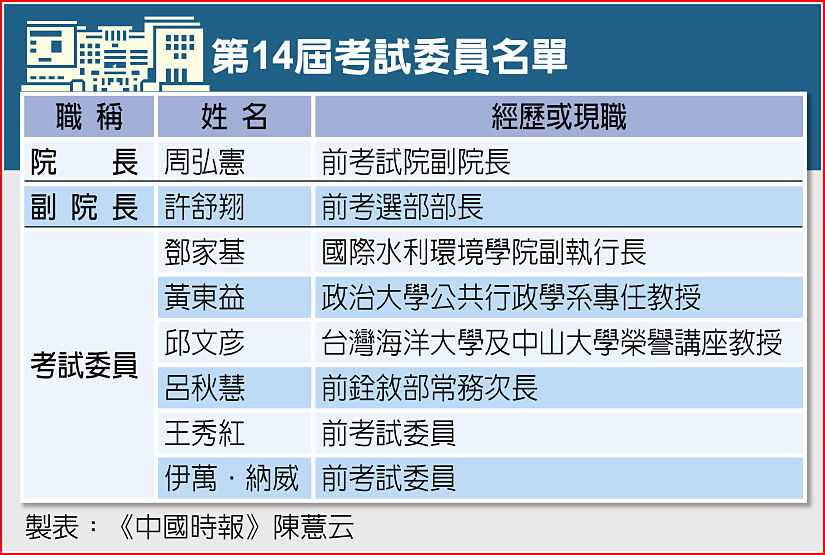 賴總統提名前考試院副院長周弘憲出任第14屆考試院長、前考選部長許舒翔出任考試院副院長,以及7名考試委員被提名人,昨在立法院會投票。