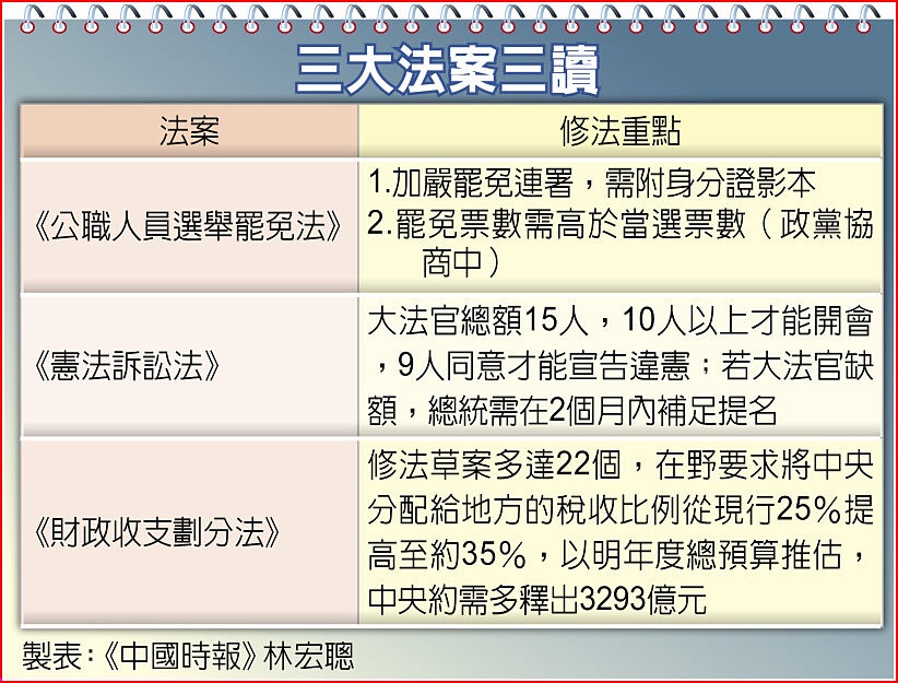民進黨低估國民黨戰力,導致20日立法院院會「三法戰役」全面潰敗,內政部長劉世芳日前曾針對《選罷法》修法喊出考慮釋憲,綠委林俊憲昨也說,政院應拒絕「副署」,阻止惡法施行。藍委傅崐萁則表示,這次「審好審滿」是全國人民的勝利,還有許多福國利民法案,如65歲以上排富免健保、免巴氏量表等修法,24日將繼續排審。