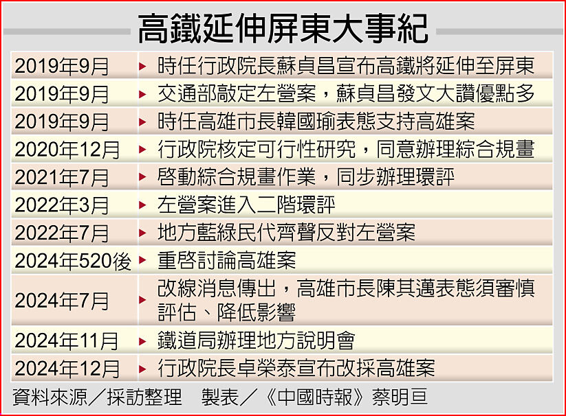 高鐵延伸屏東路線原先規畫「左營案」,行政院長卓榮泰28日推翻前朝決定,改成「高雄案」。前交通部長賀陳旦直言,當年不尊重專業匆忙定案,是不可原諒的疏忽,高鐵南延牽涉層面廣,且資金龐大恐致跨世代財務負擔,甚至應透過公投討論。