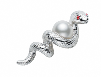 一款是金蛇珍珠胸針,金蛇纏繞在鑲嵌石榴石的鉑金樹枝上,優雅華麗,另一款則是銀白蛇蜿蜒成草寫的「M」字,雙眼鑲嵌紅色尖晶石,兩款皆搭配光澤明亮的Akoya珍珠,靈蛇懷珠的寓意,增添蛇年好運氣。
