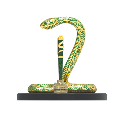 都彭(S.T. Dupont)在蛇年推出生肖蛇打火機、書寫筆具的高級珠寶套組,以精湛的雕刻工藝勾勒靈蛇神祕、智慧的尊貴特質,由於「木蛇」年的色彩是綠色,特別選用鮮豔的綠色為主題色調,蛇年生肖底座以掐絲琺瑯工藝在蛇身上融入吉祥圖騰,再填上綠色琺瑯,金與綠的對比色調奢華耀眼,再鑲嵌鑽石、紅寶石和祖母綠等珍貴寶石,完美展現蛇的優雅與力量。