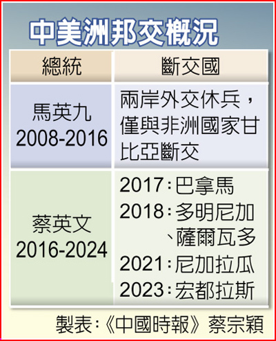 2007年陳水扁時期哥斯大黎加與我斷交,但馬英九時期兩岸外交休兵,中美洲邦交國基本沒有太大變化,但到了蔡英文任內開始走下坡,任內中美洲有5個國家斷交。
