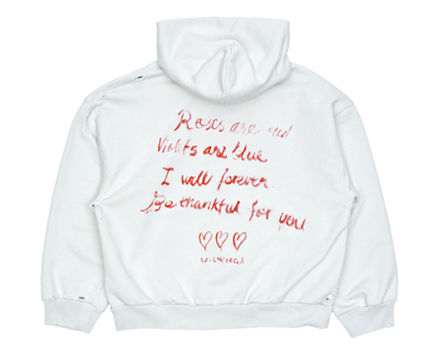 他們身上也同時穿有Balenciaga為此次情人節發表的系列商品,包含如印有手寫字體「Happy Valentine’s Day」的連帽上衣,上頭還印有一首情詩;服裝版型有oversize與small fits版型可供選擇,加上灰色與米白色的色系選擇,低調且不張揚,如同戀愛中的情侶般,沉浸在兩人的世界之中。