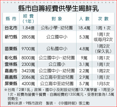 台北市「生生有鮮乳」自籌每年約1億8400萬元;蔣萬安說,希望孩子喝到鮮奶,北市府4月正式推動「生生喝鮮乳」政策,希望更多縣市一起推動,讓全台灣孩子都能喝到本土優質鮮奶。目前初步規畫小學與幼兒園18.4萬孩子每周喝1次,未來若經費許可,會考慮擴大到國中、高中,並增加次數。