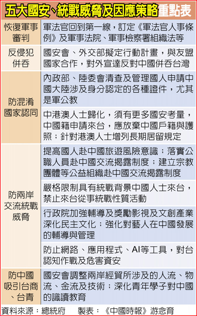 他說,這樣的中國,已是我國《反滲透法》所定義的「境外敵對勢力」,台灣沒有選擇,必須採取更積極作為,因此針對當前台灣面臨的五大國安及統戰威脅,提出17項因應策略。
