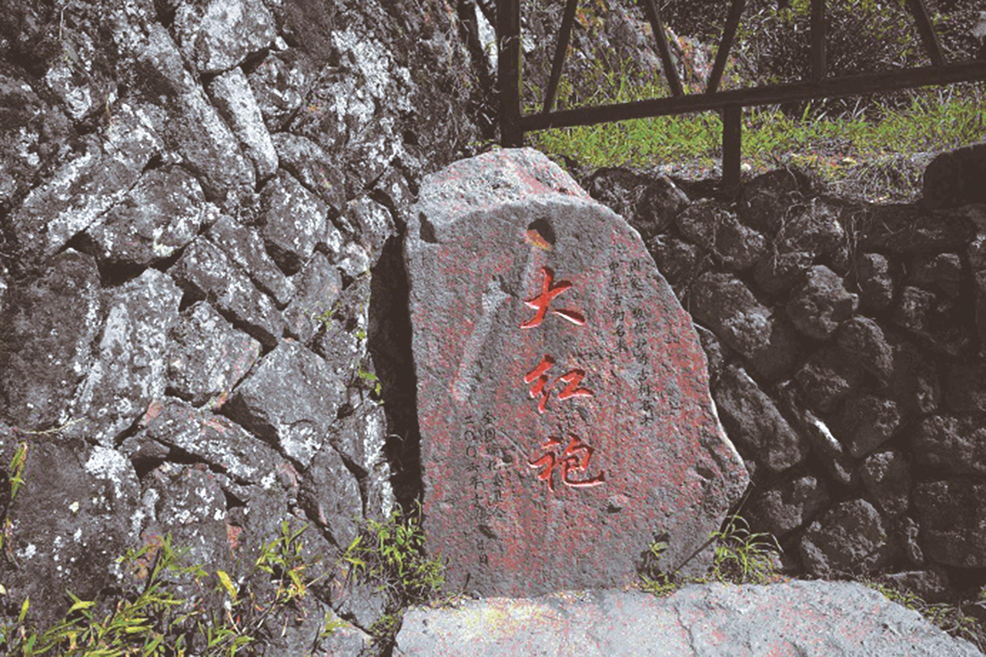 「大紅袍」母樹景長在九龍窠高岩峭壁上,岩壁上至今仍保留著1927年天心寺和尚所寫的「大紅袍」石刻。 (林洛安攝)