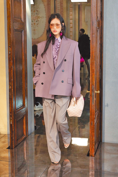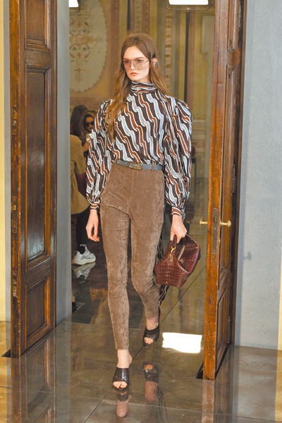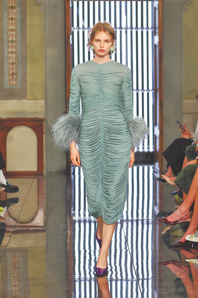 回歸佛羅倫斯這個有織品、皮革工藝的重鎮,自然不可放過適合展現品牌工藝的時刻,帶有復古、奢華的錦緞、緹花面料上展現出的服裝色澤,以及在這些面料上的精湛刺繡、水鑽珠繡、蕾絲工藝等都值得細看,而皮革工藝則是透過各式包款配件,呈現眾人眼中。