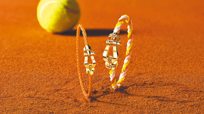 五款手鍊中,奢華版滿鑲了白鑽、黃鑽與日光色系寶石,並以漸層排列,靈感來自紅土場的陶土紅色調,鍊釦的側面刻有獨特的網球圖案,另有鑲嵌赤陶色石榴石或紅寶石等款式,編織手鍊的設計也別具巧思,以赤陶紅色與白色交織呈現,向紅土球場的代表色致意,並搭配亮眼網球螢光黃細節,展現陽光運動感。