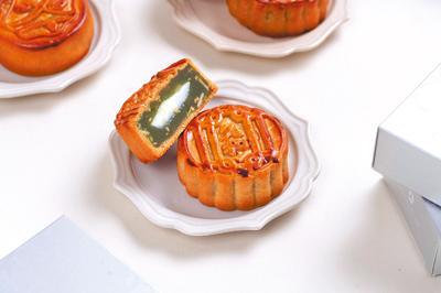 「錦月雅韻」禮盒內含9入廣式小月餅,包括豆沙奶黃流心、豆沙蛋黃與創新客家擂茶口味,每款口味各3入,售價1580元。奶黃流心鹹香濃郁,豆沙蛋黃醇厚,是歷久彌新的月餅代表。