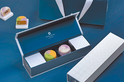白雪乳酪以乳酪搭配黑糖Q心,香甜不膩;百香金柚融合果粒,帶來視、味覺饗宴。禮盒包裝延續日式美學,以格紋描繪月影光暈,配色溫潤宛如月夜。另外,2025年還有內含蓮蓉蛋黃、蓮子豆沙、與蓮蓉XO醬的中秋限定款蛋黃酥禮盒,三種口味各4入。