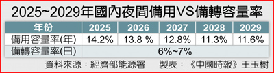 報告預估,2025年夜尖峰備用容量率是14.2%,之後兩年掉到13%、12%,再來2028與2029年,落到11.3%與11.6%,都不足法定的15%,如果更精準扣掉大修、故障機組的每日備轉容量率,台電預估更僅落到6%至7%。不過從2030年起到2034年,備用容量預測卻突然大跳升,跑到19.6%至28.9%之多。