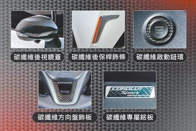 和泰汽車表示,限時免費升級黑鑽石工藝碳纖維套件組僅500組,碳纖維材質不僅輕量堅固,更能凸顯出COROLLA SPORT獨有的動感線條,內容包含有碳纖維後視鏡蓋、碳纖維後保桿飾條、碳纖維啟動鈕環、碳纖維方向盤飾盤、碳纖維專屬銘板,全面展現COROLLA SPORT熱血跑格。