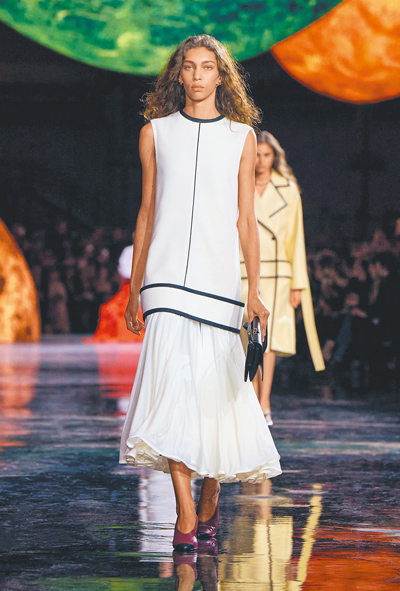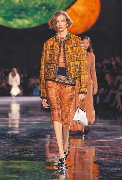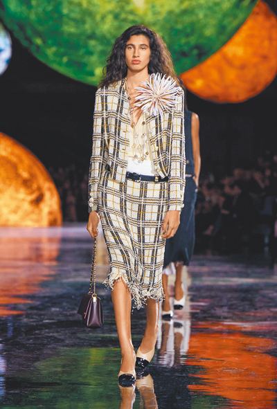 壓軸篇章《普世魅力》則回歸品牌最具象徵性的語彙:結構、材質與自由。斜紋軟呢與絲質內襯交錯出層次對比,透明材質與手工編結揭示了新一代香奈兒套裝的結構美學。充滿奔放花卉元素設計的裙裝,則源自香奈兒女士與Boy Capel愛情之中的每朵鮮花記憶;配飾部分則堆疊出夢幻的宇宙意象——從巴洛克珍珠、玻璃星球耳環,到以琺瑯鍊帶為基底的項鍊,每一件都像在訴說品牌的未來語言。鞋履依舊保留對比雙色鞋頭設計,卻以更輕盈的比例讓步伐顯得從容穩定。