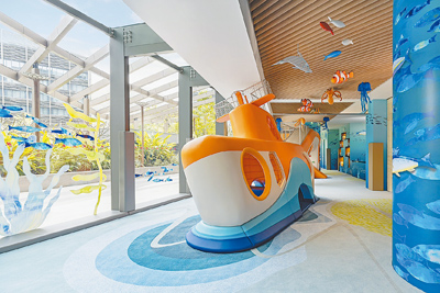 這裡最受歡迎的是上下兩層設計的礁湖主題泳池,上層是Spa與按摩池,下層為兒童戲水區,還有海盜船造景與鯨魚滑梯能讓小朋友放電;館內的互動螢幕更能讓小朋友與虛擬海洋生物揮手打招呼,玩樂中自然學習海洋保育,加上M Passport親子活動(如烘焙、手作、尋寶),讓家庭遊客從早玩到晚都不無聊。