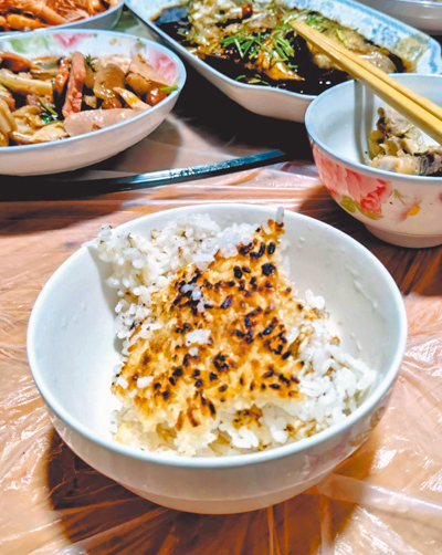 彷彿電影《不可能的任務》,阿湯哥讀完密件後密件自燃,我覽畢情景,平行宇宙也自動消失。走出廚房,到餐桌坐定,堂弟媳端出一盤鍋粑飯,望著桌上的鍋粑飯,眼眶瞬間溼潤,那一塊塊鍋粑都是回憶和思念啊,噙住淚水低頭猛挑鍋粑啃,大哥大嫂堂弟媳堂弟侄女侄婿等一桌子人全都不懂為何我獨鍾鍋粑啃個不停,臨別前,還要把剩下的鍋粑打包帶走。
