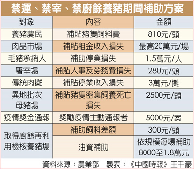 豬隻飼料每頭補貼810元;肉類市場禁止拍賣期間每場最高補助20萬元;毛豬承銷人每人給予1.5萬元;屠宰場每頭給280元補貼;傳統肉攤暫停營業期間,每攤3萬元補助。(相關新聞刊A8)