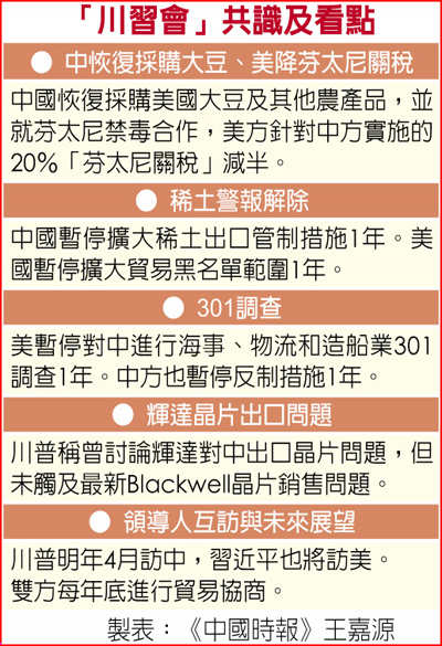 美中雙方提到有關關稅、稀土、農產品採購等方面的成果。川普表示,中國將立即恢復採購大量的美國大豆及其他農產品。作為回報,美國針對中國出口用於製造芬太尼相關化學品所加徵的關稅,將從20%降至10%,這使中國輸美商品整體關稅稅率從57%降至47%。大陸商務部則稱,雙方就芬太尼禁毒合作達成共識。