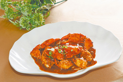 上海風味經典「醬爆蟹年糕」是一道標準甜鹹並陳的上海風味經典佳餚,以新鮮活蟹搭配Q彈的年糕醬爆快炒,蟹肉肥美、年糕入味,滋味濃郁且口感豐富,是宴席上不可或缺的重頭戲。