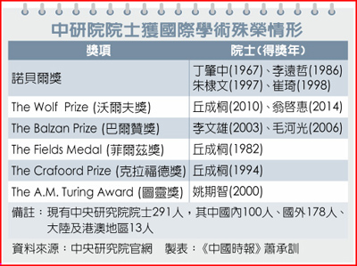 昨獲獎的中研院院士葉均蔚也是備受期待的學者之一,他昨受獎時笑稱,自己科學影響力不僅在全球排名0.03%,於材料領域更位居全球第二,而一生只念過3所學校,且大學到博士班都在清華大學完成,「是百分百的Made in Taiwan」,更笑說去年當選中研院院士,今年又獲頒總統科學獎,希望明年能再挑戰諾貝爾獎。