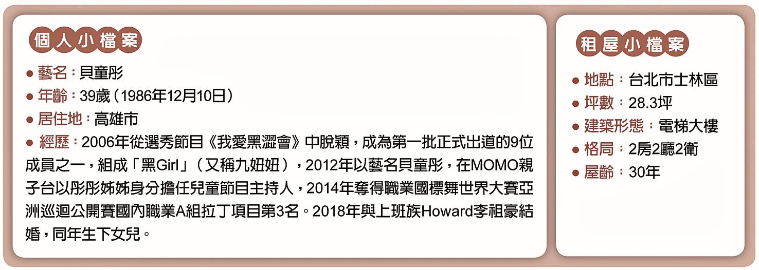 隨著婚期逼近,二○一七年,她決定出售汐止起家厝,搬入天母,與先生共組新家。對於失去第一個親手購置的房子,貝童彤有許多不捨情緒,畢竟這間小宅承載著年輕時與母親一起努力的回憶,「最後一天要交屋時,我還趴在地上哭了,謝謝這間房子陪我走過很多人生重要階段。」